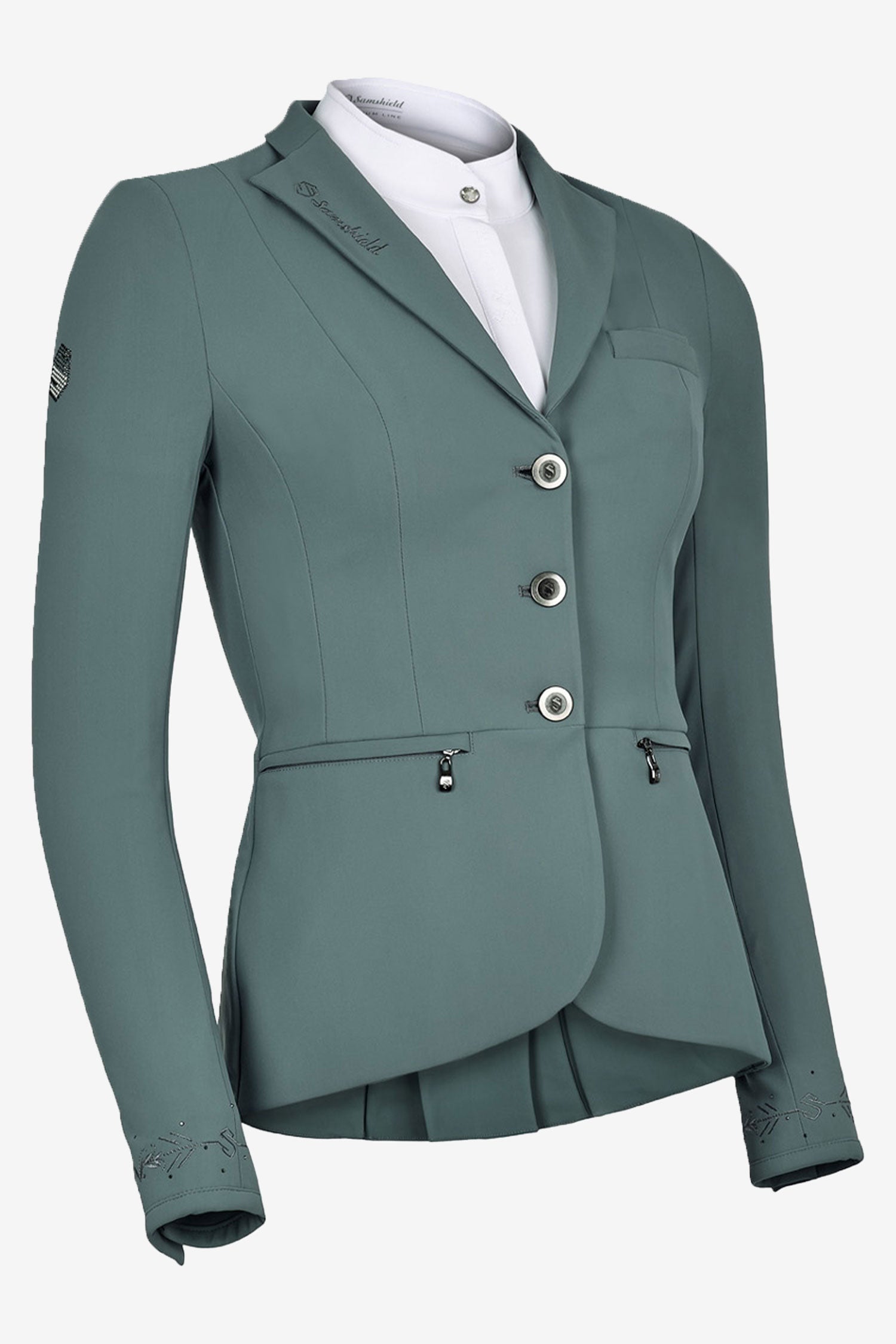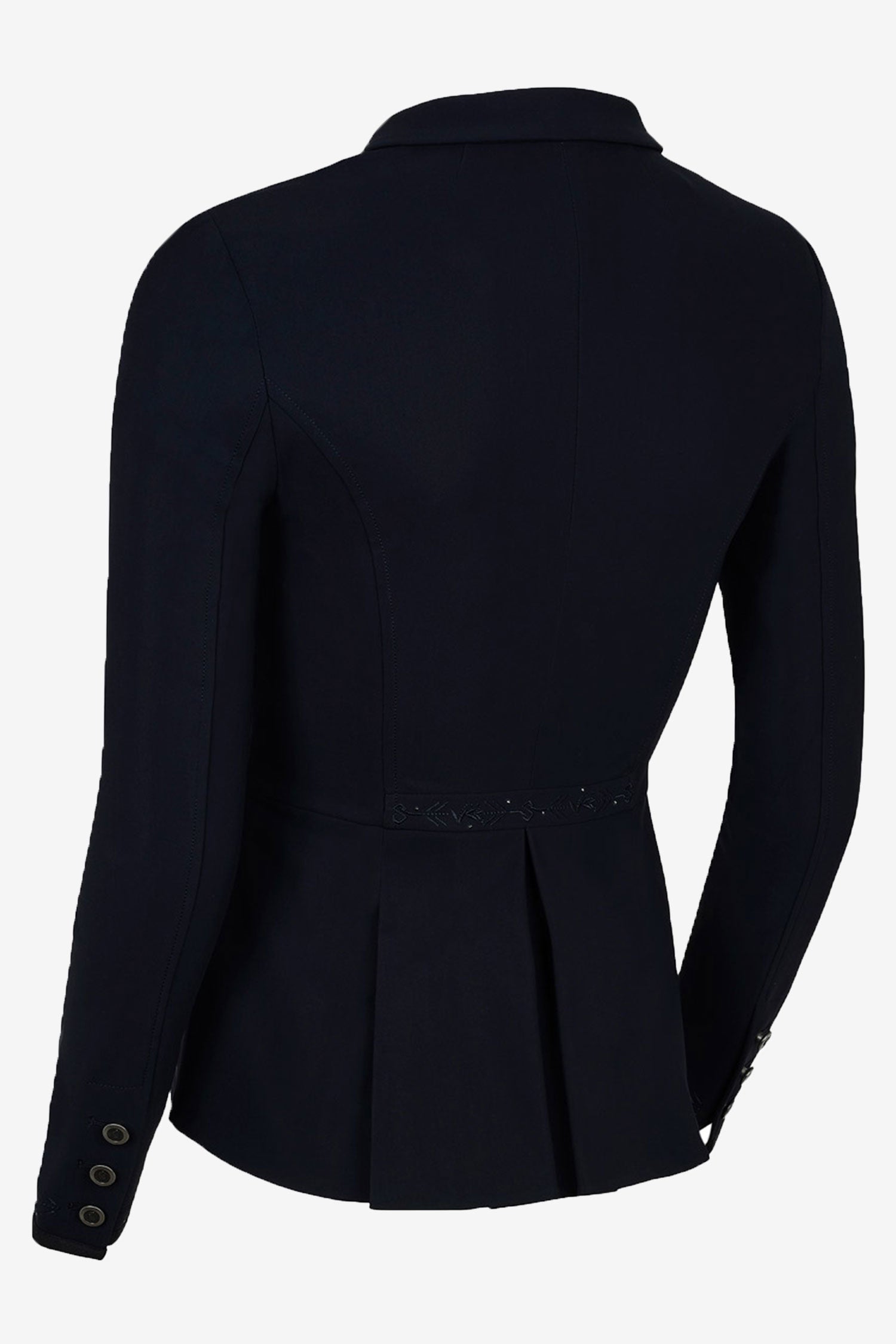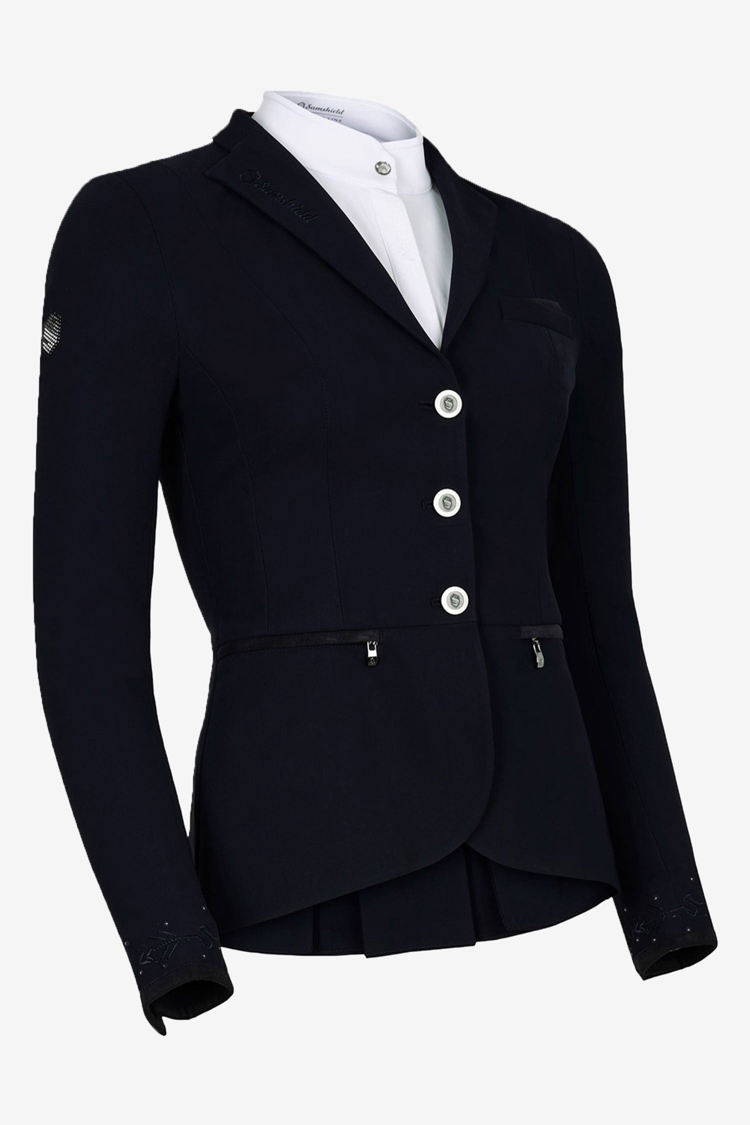 Snygg kavaj i dammodell som har Samshields logo broderad på kragen. Stängs med tre knappar framtill. Även två fickor med dragkedja. Baktill ovanför slitsen sitter ett snyggt band med dekorativt mönster av Swarovski kristaller. Samma mönster finns också i ärmsluten. Gjord i ett material som är väldigt snabbtorkande med hög komfort. Den är skrynkelfri och blockerar också solens UV-strålning. Kan tvättas i 30 grader.