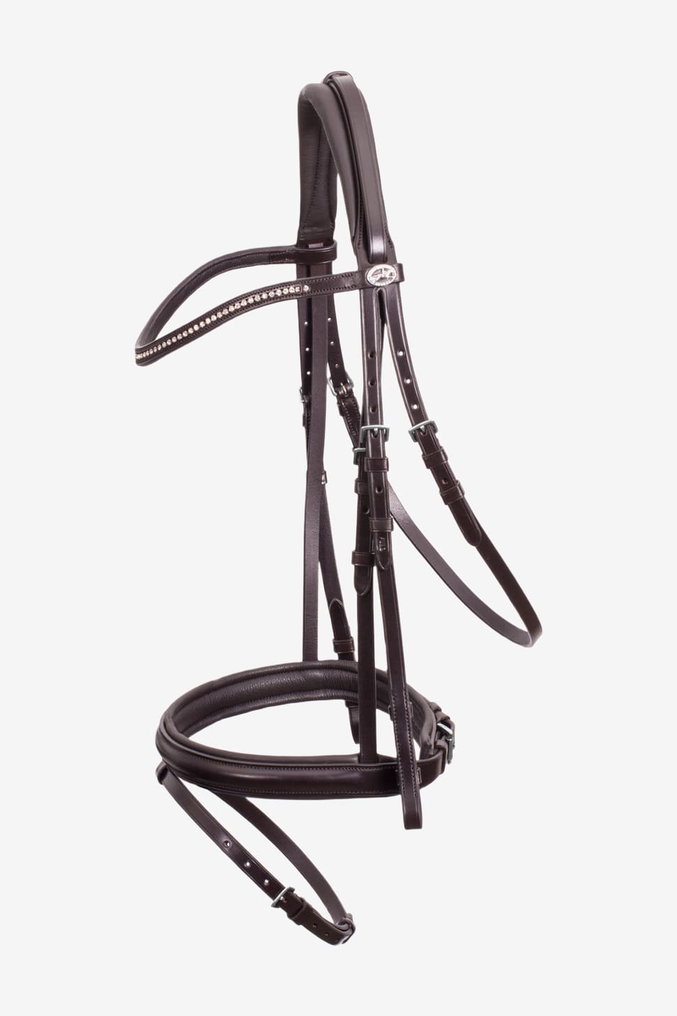 Klassiskt träns med kombinerad nosgrimma med en bredd på ca 3cm. Mjukt och följsamt läder av hög kvalitet. Anatomiskt format nackstycke för att förhindra obehagligt tryck över hästens nacke. Käkremmen går att justera på båda sidor. Diskret pannband med enkel strassrad samt logotyp.